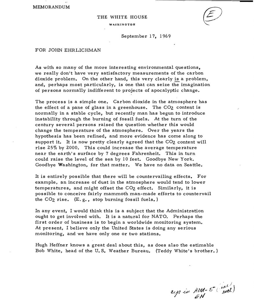 A memo to John Erlichman from Daniel P Moynihan on climate change has just come to light, and you can read about it here on the PBS website: This government memo warned of climate change in 1969.